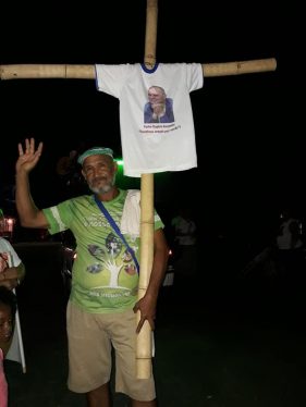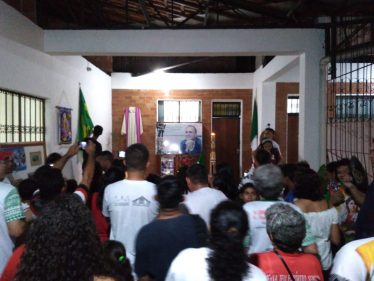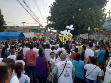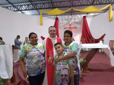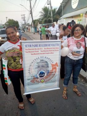 Quanto sei “neofita” del Brasile (ma ciò vale per ogni posto) a volte ti colpiscono dettagli apparentemente insignificanti per chi qui da anni vive e opera ed è implicato in cose ben più serie. A me in questi giorni ha colpito l’abitudine di “stampare” magliette per ogni evento, con immagini e scritte spesso esplicitamente religiose, veri e propri “santini” da indossare. Arrivato a Manaus, nella parrocchia di S. Etelvina, insieme a don Lucio e don Orazio, da anni fidei donum in Brasile, nella canonica dove visse e fu ucciso don Ruggero Ruvoletto siamo stati accolti con una gentilezza squisita dai due padri missionari della Congregazione di Guadalupe, p. Alejandro e p. Luiz, e per prima cosa ci hanno donato una maglietta della marcia per la pace che si sarebbe svolta da lì a poco, con impressa una grande foto del volto sorridente di don Ruggero. Di magliette raffiguranti don Ruggero, in quel pomeriggio poi ne ho viste molte altre, diverse tra loro, ma sempre con il suo volto sorridente che tutti ben ricordiamo. Significativo questo incrocio di volti: centinaia di persone sorridenti, tra cui molti con addosso il volto sorridente di don Ruggero! Persone, che dopo 10 anni tengono ancora viva la memoria di chi per loro è un vero e proprio “martire” della fede e della giustizia. Nei loro volti, c’è un riflesso indelebile del volto di don Ruggero. E tra loro molti erano i giovani e i ragazzi provenienti dalle diverse aree missionarie del quartiere periferico di Manaus, con i loro presbiteri, provenienti da varie parti del Brasile e del mondo.