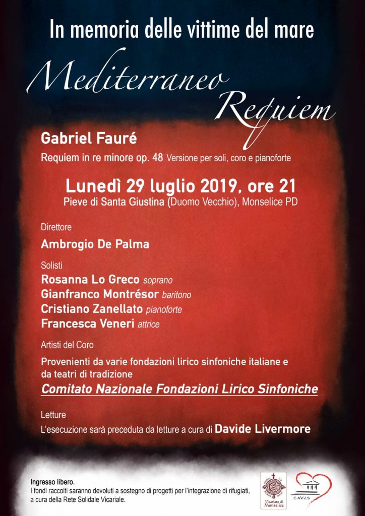 Arriva anche nel territorio della Diocesi di Padova grazie all’impegno e alla collaborazione tra il Vicariato di Monselice e il Comitato nazionale delle Fondazioni lirico-sinfoniche, MEDITERRANEO REQUIEM, un concerto-spettacolo che vede la partecipazione, a titolo completamente gratuito, di una sessantina di artisti provenienti dai più prestigiosi teatri d’Italia per offrire al pubblico un momento di riflessione e di meditazione sulla tragedia dei migranti che quotidianamente muoiono nei nostri mari. Mediterraneo Requiem è, infatti, dedicato alla memoria delle vittime del mare.